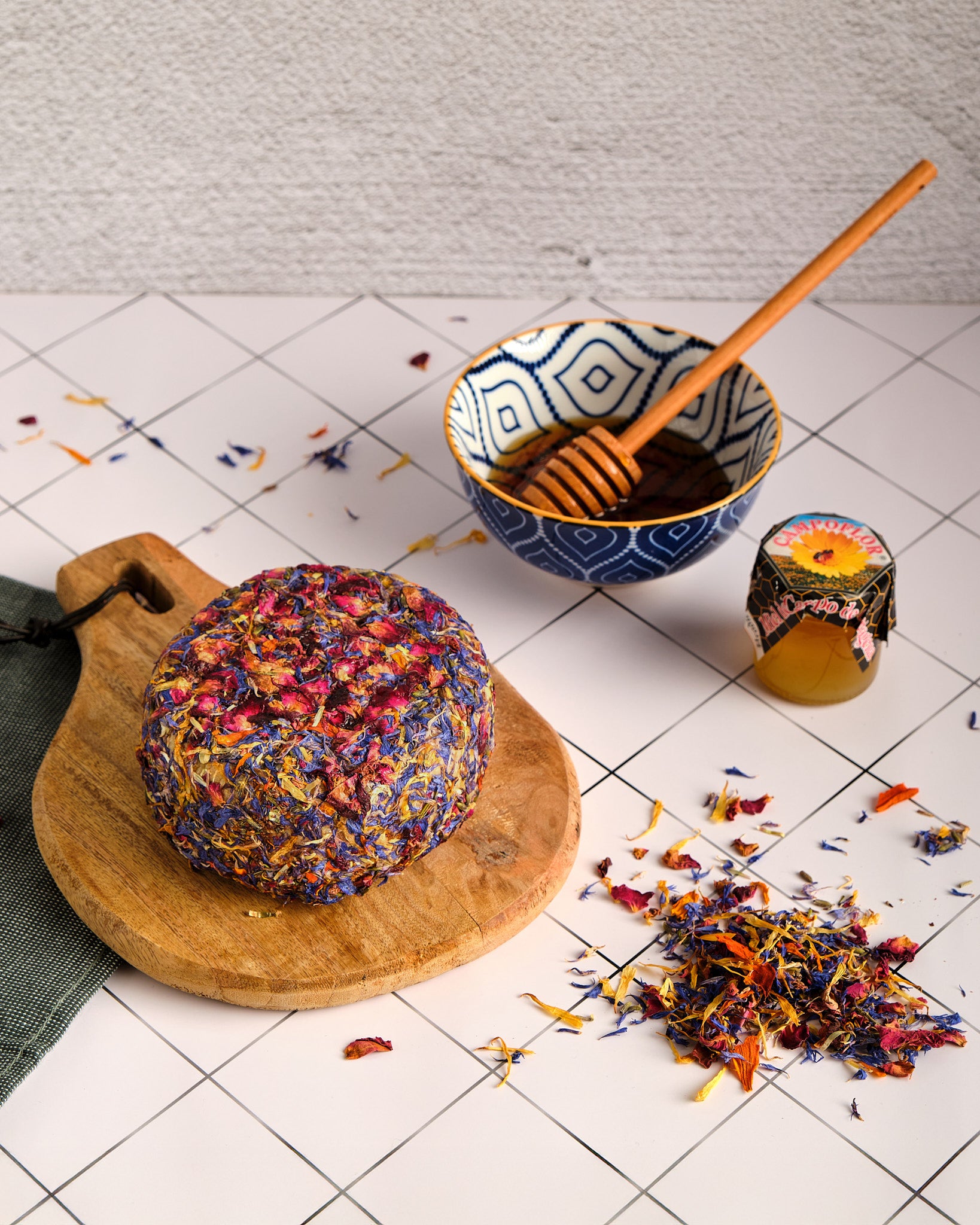 Queso Curado de Cabra con Miel y Flores y con Medalla de oro (500gr). Un queso que combina la intensidad de un queso curado con el delicado abrazo de la miel y el aroma natural de las flores comestibles.